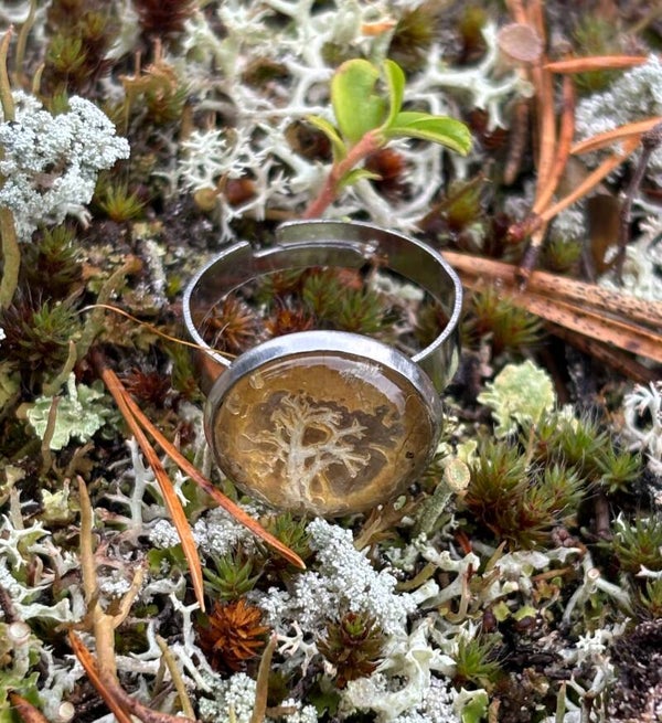 Materiaali: lasi, kirurginteräs, kuivattu palleroporonjäkälä tuomenlehdellä
